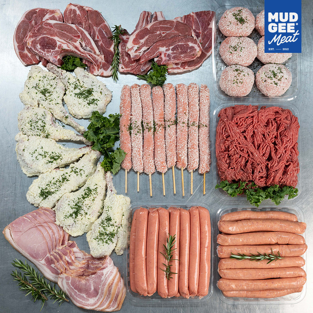 The kids will love these cuts; 1kg Lamb Sausages, 1kg Beef Sausages, 1kg Beef Mince, Crumbed Cutlets x 8, Sausage on a Stick x 8, Lamb Chops x4, Rissoles x 6, 0.5kg Premium Bacon.